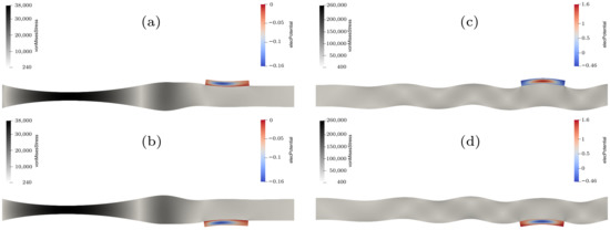 Results of the FEM-simulation of acrylic glass at 128.16 s for the symmetric mode (a,b), where the displacement is amplified 80,000 times, and at 259.36 s for the antisymmetric mode (c,d), where the displacement is amplified 10,000 times.