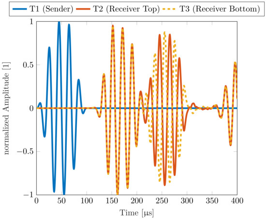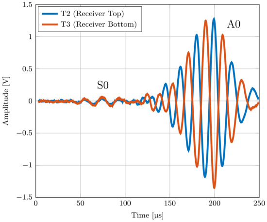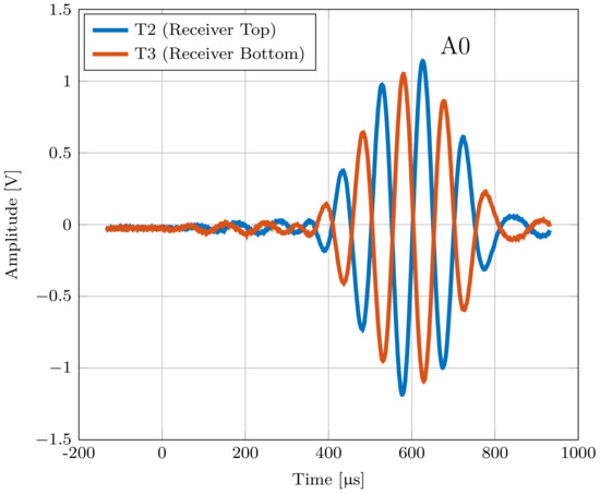 Based on the comparison between numerical and measured group velocities, it was possible to ensure that the measured mode is a symmetric or antisymmetric Lamb mode. With knowledge about the in-plane and out-of-plane displacement, which can be seen in Figure 2, the modes can now be assigned using the three-transducer setup. For this experiment, we compared the output voltage of transducers T2 and T3, which are placed on the opposite sides of the plate. Due to the same change in strain that both transducers experience during a symmetrical Lamb mode, the same output voltage is measured on both transducers. For comparison, an inverted output voltage is measured at transducer T2 during an antisymmetric Lamb mode, as shown in Figure 11.