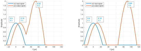 A discrete version of the Hilbert transformation can be realized using the fast Fourier transform (FFT) function as described in [11,20]. The Hilbert transformation can be used to form a complex signal . Calculating the absolute value from gives the envelope of the received and transmitted signal: