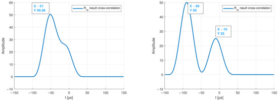 Therefore, it can be assumed that two modes with different propagation speeds exists. However, if several signals, e.g., modes with different amplitudes overlay, a shift in the result of the cross-correlation can be detected. Figure 6 also shows that the signal with the smaller amplitude no longer generates a detectable peak in the result of the cross-correlation. Therefore, it is necessary to split the detected modes before. This can be a difficult task that, on the one hand, depends on the distance between the transmitter and the receiver piezo-element and, on the other hand, on the chosen excitation frequency.