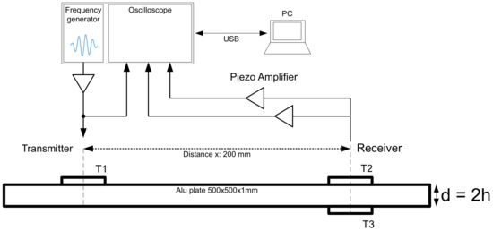 The first reference measurements were done on a 1 mm thick aluminum plate with a size of 500 × 500 mm to prevent the influence of reflections. The transducers were placed in the center of the plate 200 mm apart from each other.