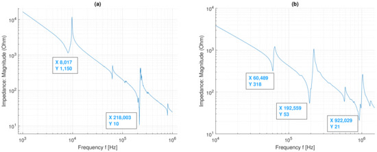 Two types of piezo-elements were used in the measurements. Piezoelectric discs type AB1290B-LW100-R from PUI audio were used for the measurements on the acrylic plate and for the LIB. This transducer has a diameter of 12 mm and a capacitance of 8 nF at 1 kHz, according to the datasheet. For the measurements on the aluminum plate, block-shaped piezo-transducers with dimensions of 17 × 7 × 1 mm were used. In Figure 9a, the impedance measurement of the used piezoelectric disc is shown. It can be clearly seen that there are two main resonance frequencies at 8 kHz and 218 kHz. According to [17], for circular piezo-elements, these can be assigned to the radial and thickness extension modes. For the block-shaped piezo-elements, the resonance frequencies can be assigned to the length, width, and thickness of the transducer, as shown in Figure 9b.