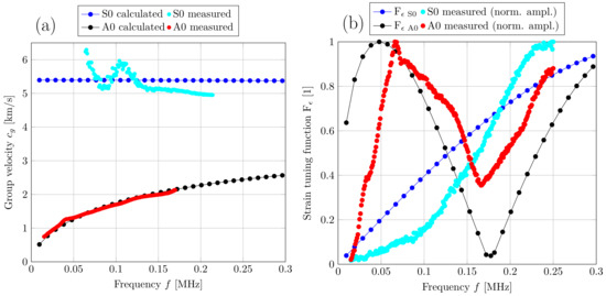 where is the wave number of the mode A0 and is the length of the transducer. Figure 10b shows a comparison between the strain response caused by the Lamb wave modes S0 and A0 and the measured output voltages of these modes. From Figure 10b, it can be seen that if the length of the transducer is an even multiple of , where the surface strain and thus, indirectly, the output voltage is at its maximum. The minimum strain and therefore the minimum output voltage occurs when is an odd multiple of [1].