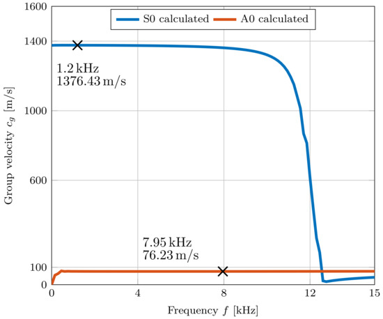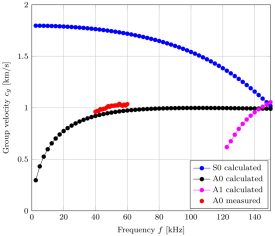 Figure 16 shows the resulting dispersion curve of the multi-layer model. It can be seen that the group velocity of the mode A0 is 76 ms−1 at 7.95 kHz.