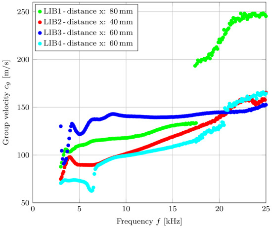Figure 14 shows the measurement results of the group velocities, which were carried out on four LIBs (1–4) of the same type. The measured group velocities vary between ≈60 ms−1 and ≈170 ms−1, with exception of the outliers in the LIB1 measurements. These outliers could be an indication of higher-order modes, which are already appearing at a frequency of 17.4 kHz. Due to the higher distance between receiver and transmitter (8 cm), higher order modes are already starting to form wave packets. These waves packets could interfere with the measured A0 mode. It can be assumed that higher order modes can also be measured on the other cells (LIB2–LIB4) if the distance between the receiver and the transmitter piezo is further increased. Even though the distance between the emitting and receiving piezo-elements of LIB3 and LIB4 are the same, the group velocity is different over most of the measured frequency range. One possible explanation could be that the two cells did not have the exact same SOC and some small deviations regarding this value occurred. Furthermore, the manual gluing of the transducers could also influence the measurement results. Due to the different thickness of the applied adhesive, the coupling between the transducer and the LIB can be affected. The differences in the measured propagation velocities of different LIBs of the same type will be part of the authors’ future research. Additionally, it is also interesting how the group velocity of the antisymmetric Lamb wave behaves during cycling and whether this behavior varies between two different cells of the same type.
