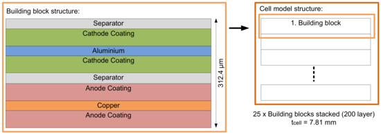 To simplify the structure of the cell model, it was created using several building blocks, as shown in Figure 15. One building block consists of an anode, cathode, and separator. These building blocks, each with a thickness of 312.4 µm, were stacked until the cell had a total thickness of 7.81 mm. As a result, a model with a total number of 200 layers (25 building blocks) was created. The thickness of 7.81 mm corresponds approximately to the thickness of the cells used in the measurements.