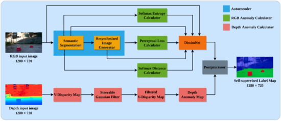 In this work, we define the problem of detecting drivable areas and road anomalies using RGB-D data as the detection of ambiguous areas and road segmentation by utilizing the uncertain-ty estimation in the wrong classification of pre-trained semantic segmentation while encountering anomalous objects (i.e., a brick in the working environment) and elevate the depth information to enhance the anomalies extraction results. The proposed architecture of AGSL is illustrated in Figure 2. We briefly summarize the high-level characteristics here and discuss each part in more detail in the following subsections. The architecture can be divided into five distinct modules: auto-encoder, RGB anomaly calculator, DissimNet, depth anomaly calculator, and post-processor. In the end, the system outputs the final self-supervised label maps with drivable area and road anomaly segmentation results.