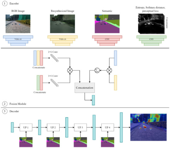 The DissimNet module takes the RGB image, semantic segmentation map, resynthesized image, as well as the ambiguous maps (softmax entropy, softmax distance, and perceptual loss) calculated in the previous step as the inputs to extract high to low-level features for each image with VGG [28] in order to generate the anomaly map. The DissimNet consists of three components (encoder, fusion module, and decoder), as seen in Figure 3.