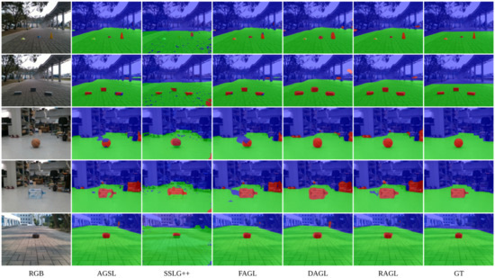 In the second part, to verify the effectiveness, we show the comparison of SSLG++ labels, manual labels, and our AGSL labels on the GMRPD dataset trained on an RGB-D semantic neural network FuseNet named FSL++, FML, and FAGL; trained on Depth-aware CNN network named DSL++, DML, and DAGL; trained on RTFNet network named RSL++, RML, and RAGL, respectively. The reason we do not compare with the original SSLG labels is because of missing the detail of the validation and testing set. In this work, we use scene 12, scene 13, scene 14, and scene 29 with a total of 571 images to evaluate our training session. As shown in Table 1, the evaluation results on three off-the-shelf RGB-D networks such as FuseNet, Depth-aware CNN, and RTFNet using AGSL labels show a high increment compared to our reimplementation SSLG++, which leads to the precision improvement (Pre) of 85.03%, 86.88%, and 98.52% in terms of drivable area segmentation and 74.61%, 47.85%, and 58.32% in terms of road anomalies segmentation for FuseNet, Depth-aware CNN, and RTFNet, respectively. In addition, the results trained on AGSL labels demonstrate a comparable performance compared to those trained on manual labels.