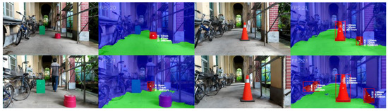 Furthermore, we apply the trained FuseNet network in real-time segmentation testing using a laptop equipped with GeForce GTX 1070 Max-Q, 8GB RAM while controlling our mobile robots. Our mobile robot installed an OAK-D camera as a visual perception component. The f-number of the OAK-D camera is f/2.0, and the angle of view is (H × V). The results show that 20 fps is the stable speed for our devices to work smoothly and perform remarkable results for segmentation and localization of road obstacles in real-world coordinates in both indoor and outdoor environments, as shown in Figure 7.
