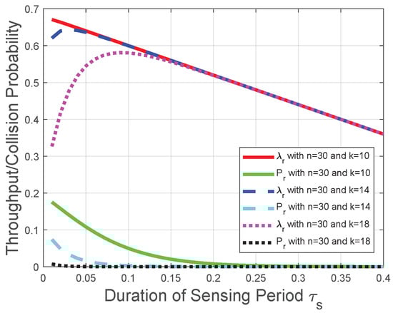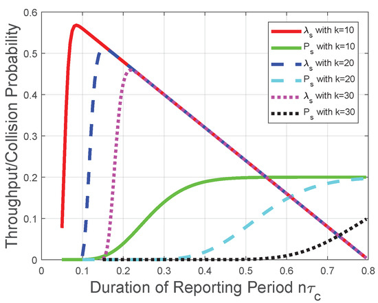 - When , the throughput decreases with the number of mini-slots n when tends to 0. Comparing it with the third item, the collision probability is less likely to increase with the duration of the reporting period due to the larger value of k. The optimal n depends on , and k.