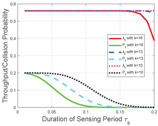 - When , the monotonicities of the throughput and collision probability depend on the values of , , and k.