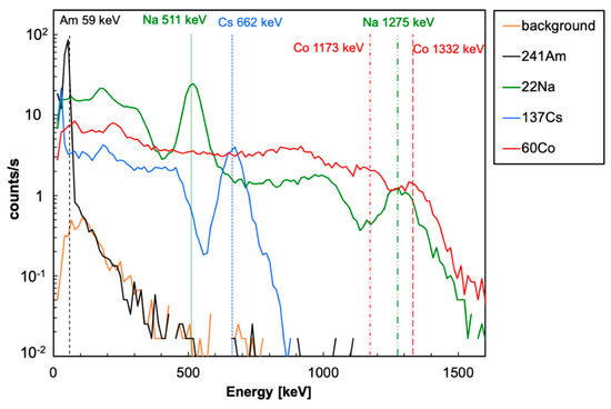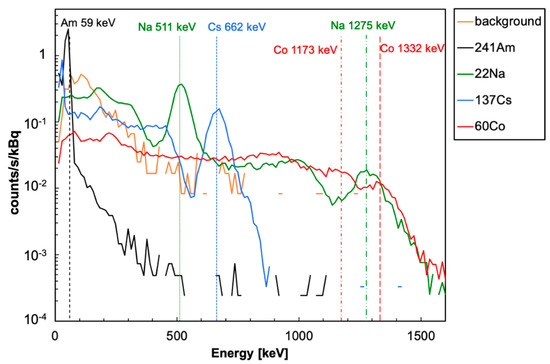 Each source in turn was placed at a distance of 2 cm from the central detector, with a geometrical efficiency of about 2%, and the corresponding spectrum was acquired in 120 s. A spectrum without a source was also acquired to assess the contribution of the background. In Figure 6, the five resulting spectra are plotted for a linear calibration involving all six peak energies from Table 1. One can immediately see that the background contribution, with the chosen threshold set around 30 keV, is a few orders of magnitude below the real spectra. In order to make a more quantitative and reliable comparison, the plot shown in Figure 7 was produced, whereby the gamma spectra were normalized to each source activity. One can observe that in the adopted configuration (i.e., 2 cm source—detector distance), 1 kBq activity is still clearly visible above the background for all sources. It has to be remarked that being the two 60Co peaks close to each other, their resolution appears to be worsened by the partial superposition of their tails.