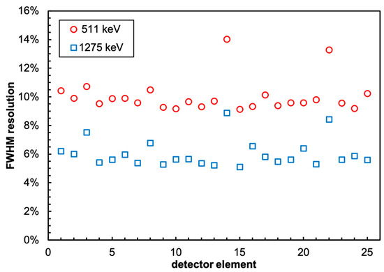 The energy resolution measured for the 25 detectors at 511 and 1275 keV.