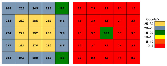 Overall count rates of the 5 × 5 array above a threshold of 30 keV. Left: without the collimator; right: with the collimator.