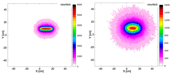 In light of these promising results, the FLUKA code was used to perform two simulations in order to assess the possible performances of a larger table array [15]. A similar setup was simulated but made of 100 × 100 CsI(Tl) scintillators, in combination with a 1 MBq 137Cs gamma source uniformly distributed over a metal sheet measuring 2.5 × 20 cm2 placed at 1 cm distance from the table. The second simulation was done with the same setup and the source at 5 cm distance. The expected spatial distributions of the count rates for the two cases are shown in Figure 14.