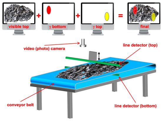 Usage with objects on top of the table was assumed, and this is why distances of 1–2 cm were mainly considered, but one could use larger distances by possibly employing collimators for better-quality imaging. Several geometrical arrangements can be devised, being either rectangular and/or with more sparsely distributed scintillators, with a tradeoff between the space resolution and cost. One possible arrangement in particular is worth mentioning, i.e., a linear array in a fashion similar to the airport baggage scanners. This would represent an interesting tradeoff between the cost and scanning time, without sacrificing the space resolution. In Figure 15, a possible configuration is sketched of a radwaste scanner based on a conveyor belt, a video camera and two linear arrays of detectors. The bottom array would be embedded in the conveyor and the top one would be installed on an up–down actuator in order to be moved closer to the materials to be inspected. As an alternative, the conveyor belt could be replaced by a fixed surface and the two linear arrays could be moved to scan the observation field. The scan would be done line-by-line, in steps of 1 cm, and the data could be acquired during predefined time intervals or with variables as a function of the detected counting rates. Should a threshold be overcome, indicating the presence of a hot-spot, the operator could decide to perform a finer spectroscopic analysis.