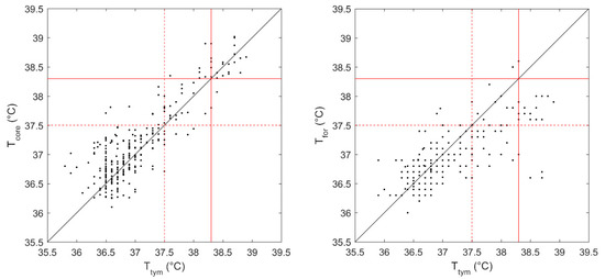 The estimated core temperature (Tcore) (left panel) and the forehead temperature (Tfor) (right panel)are plotted against the tympanic temperature (Ttym) for each measurement. The red dotted line at a cut-off temperature of 37.5 °C indicates the presence or absence of “hyperthermia”, while the red line at a cut-off value of 38.3 °C indicates the presence of “fever”. The black line suggests the identity with Ttym.