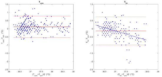 Comparison of the paired temperature measurements. Bland–Altman plots for the estimated core temperature (Tcore) and tympanic temperature (Ttym) (left panel) and for the forehead temperature (Tfor) and Ttym (right panel). The continuous red line indicates the mean difference between the Tcore or Tfor and Tym, while the red dotted lines indicate 95% confidence intervals. The blue line indicates the regression line between the difference between the two measures and the mean temperature for each paired measurement.