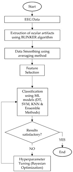 To the best of our knowledge, few studies have been conducted to determine whether drowsiness can be detected from ocular features extracted from EEG signals that have not undergone artifact removal [25,26]. Therefore, in this study, we attempt to answer the question: “Can we use ocular indices extracted from EEG signals contaminated with eyeblink artifacts as drowsiness indicators”? In this investigation, we used BLINKER software developed by the authors in [27] to extract ocular indices from EEG signals. The embedded feature selection method was then used to select the most effective and valuable ocular parameters obtained from BLINKER for the classification. In this study, we investigated both traditional machine learning techniques and deep learning methods for classification.