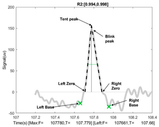 The BLINKER toolbox [27], which works on the MATLAB platform, was used to extract ocular indices from EEG eyeblink artifacts. BLINKER detects the intervals and potential blinks created from the EEG signal when the signal is more significant than 1.5 standard deviations above the overall signal mean. It considers only those possible blinks that stretch for more than 500 ms and are at least 50 ms apart. BLINKER employs a tent-fitting method to define blinks because typical blinks have rounded, tent-like shapes. Figure 2 shows a schematic of a sample blink artifact with various blink landmarks. LeftZero is the last zero crossing. If the signal does not cross zero between the current blink and the previous blink, LeftZero is the frame with the lowest amplitude. A similar definition is applied to the RightZero frame.