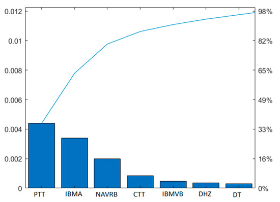 The tree-based embedded method selected 7 useful features out of the 25 features provided by BLINKER, which increased the accuracy of the predictive models. The features are the peak time tent (PTT), inter-band maximum amplitude (IBMA), negative amplitude velocity ratio base (NAVRB), closing time tent (CTT), inter-link maximum velocity base (IBMVB), duration half zero (DHZ), and duration tent (DT). Figure 3 shows the best features selected from the 25 features. The y-axis on the left and right shows the importance value of each bar and the cumulative percentage of the feature importance, respectively. The x-axis represents the feature indices. The line graph above the bar shows the cumulative sum of the importance values. Feature importance indicates the variables that are more relevant to the target classes. The feature importance value of 98% shows that the seven selected features can improve the predictive model’s performance and reduce the computation cost. These seven features were used to train the decision tree, KNN, SVM, ensemble of bagged trees, and ensemble of boosted tree classifiers.