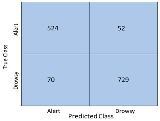 After preprocessing, 1963 eyeblink artifacts with 25 features were selected for training and testing. This resulted in 49,075 features that were sufficient for training and testing the models. Of the 1963 eye-blink artifacts, 1288 eyeblink artifacts belonged to the “Drowsy” class while the remaining 675 eyeblink artifacts belonged to the “Alert” class. For predictive modeling, it is important to split the data into training, validation, and testing sets, which allows the development of a highly accurate model. The training set was the dataset used to train the model, and the model learned the underlying patterns from the training set. The validation set was used to validate the performance of the model during training, and the test set was a separate set of data used to test the model after training. In this study, 70% of the data was used to train and validate the models, and the remaining 30% was used to test the models.