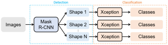 Our proposed approach is divided into two stages. The first one focuses solely on detecting the shape of the traffic sign. To do that, we utilize a well-known CNN model, Mask R-CNN (Figure 8). It is important to notice that this stage does not recognize all 23 classes included in the dataset but only three distinct shapes that appear in it, triangular, circular and rectangular. The goal of the second stage is to correctly classify previously detected and divided shape traffic signs into the aforementioned 23 classes. According to the output of Mask R-CNN, each traffic sign is extracted from the original image and then used as an input of another CNN model, Xception, which is the final part on our way to classification.