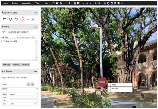 In the case of Mask R-CNN, the model needs the outline points of the object to generate the mask. We once again use the “VGG annotator tool” to create an annotation file. Use the “Polygon” method in the tool to select objects and add labels (Figure 6). After saving it as a .json file, it can be imported into the model. Therefore, in addition to the name of the image, the .json file also contains the x-coordinates and y-coordinates of the outline point of each traffic sign in the image.