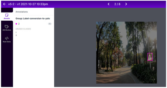 Regarding the dataset, after collecting the imagery necessary for the creation of the dataset and labeling it using the VGG annotator tool, the team needed to prepare the data for training. All used models utilize different annotations formats, as well as use different image resolutions. In the case of YOLOv5, all annotations had to be converted to the so-called “YOLO format”, which is a format universally used by all YOLO models. The main principle of this format is the design of bounding boxes and how they are portrayed in the annotation files. Bounding box coordinates must be normalized in “xywh format”. If boxes are in pixels, we can obtain coordinates by dividing x_center and width by image width and y_center and height by image height. In the YOLO format, an annotation file is created for every single image in the dataset, where each row relates to a single detected object and is translated to the class, x_center, y_center, width and height of the detected object. To perform the tasks of annotations preparation, an online open-source annotation converting tool, Roboflow, is used (Figure 11).