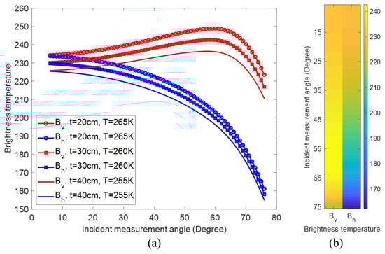 Herein, denotes the specific intensity of horizontal and vertical polarizations, which is independent of the azimuthal angle . and are the extinction coefficient and absorption coefficient respectively. The phase matrix is simplified by using 1–2 frames [28,31]. means the transmissivity matrices from ground to snow and from snow to snow. Combing the boundary conditions [30], these differential equations could be analyzed in the whole layers. The details of solving these equations could be found in [30,32], and it is demonstrated that the results of the multilayer QCA/DMRT agree well with the CLPX ground measurement [32]. In this paper, the input medium physical parameters of DMRT are: (1) snowpack thickness t; (2) physical temperature T of the snowpack. From these parameters, the brightness temperature in vertical polarization and in horizontal polarization at various observation angles could be simulated by the above model.