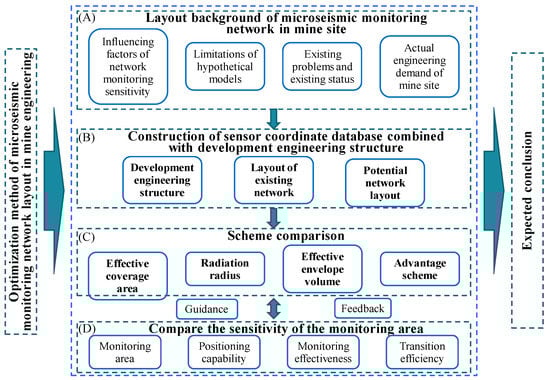 To further improve the efficiency of the network layout, an optimization method for the station layout of an MSM system for underground mine engineering is proposed, based on the comprehensive calculation and evaluation of the coverage area, envelope volume, effective coverage radius, and minimum energy level induction value of any network. This method firstly constructs an indexed dataset (S-V-E-R-V) from potential sensor placement points, calculates the solutions in the proposed library according to the index values, then weighs and normalizes them and, finally, obtains coverage within the same target range. The results of the maximum efficiency of the network layout plan verify its effectiveness and practicability. The specific innovative technology route is shown in Figure 1 below.
