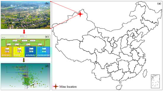 Microseismic monitoring (MSM) system of the Ashele Copper Mine: (a) the geographical location of the analysis area; (b) geography of the target mine; (c) topology map of the microseismic monitoring system of the target mine; (d) deployment and monitoring of the microseismic monitoring system.