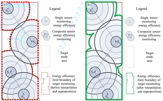 Schematic diagram of the minimum energy magnitude induction sensitivity envelope before and after interpolation superposition: (a) the schematic diagram of the energy efficiency range of a single sensor; (b) the schematic dia-gram of the superposition of the energy efficiency of the sensors under the composite condition.