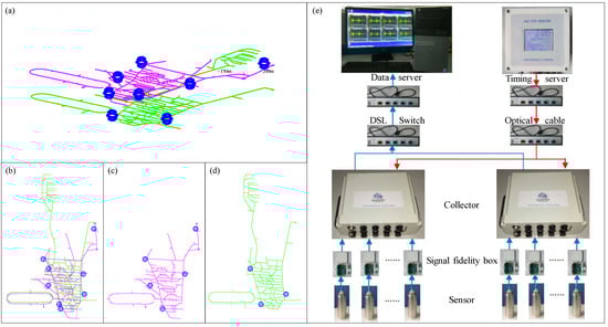 Mine development layout and the existing MSM sensor network layout engineering drawing: (a) 3D perspective view; (b) overall top view; (c) +200 m middle section plan; (d) +150 m middle section plan; (e) hardware equipment connection diagram.