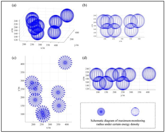 The specific schematic is shown in Figure 5. Specifically, within a certain distance range, the ability to monitor the event’s energy level is derived from the detectable radius, which is obtained from the statistical data of the mine. According to the mine’s field data, the radiation energy of each sensor and its corresponding monitored events are analyzed, and the relationship between the energy attenuation and the radiation radius is comprehensively analyzed and fitted. In the network layout scheme, the maximum sensing radius of the smallest event that can be detected by each sensor is superimposed upon the others to form a new energy level sensitivity envelope, which is interpolated to obtain the lowest energy level sensitivity envelope and volume space parameters and, finally, calculate the new envelope volume.