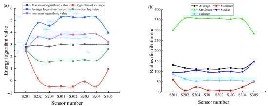 Specifically, this analysis is based on the MSM data of the +150 m middle section and the +200 m middle section of the second phase of the mine. The intuitive distribution of the statistical data values is shown in Figure 8. Figure 8a shows the intuitive distribution relationship between the sensors in the target study middle section and their log energy values, and Figure 8b shows the intuitive distribution relationship between the sensors in the target study middle section and all sensing radius values in the statistical period.