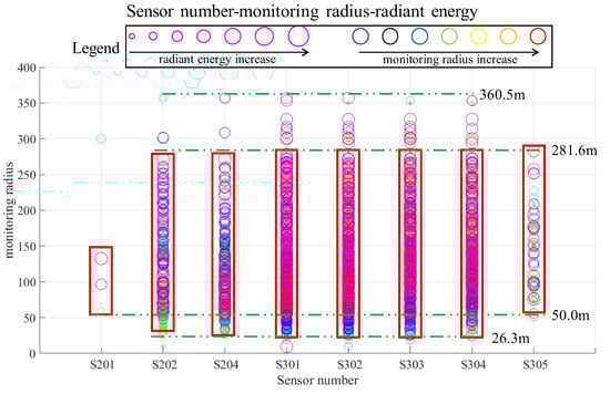 From the display in Figure 11 and the analytical process of the aforementioned formula, it can be seen that it is helpful to observe the monitoring sensitivity of the energy levels of monitoring events in different regions and to make visual sensory judgments to carry out the primary optimization of the network layout method. This procedure is used to obtain the radiation radius data and calculate the required geometric parameters, to provide detailed data support for the comparability and applicability of the optimization scheme. Then, the most important thing is to help judge the different distributions of sensors in the network and the different monitoring effects. In addition, its visualization and data characteristics are obvious, which is convenient for improving the efficiency of network optimization and analysis. Specifically, the higher the relative independence of a single sensor, the worse its peripheral monitoring performance, and the lower the energy level-sensing sensitivity. The more inclusive the multiple sensors, the better the monitoring performance within a specific range, and the energy level sensing sensitivity in general. When the monitoring range is fixed, the farther away from the sensor, the worse the monitoring efficiency, and the lower the energy level-sensing sensitivity.