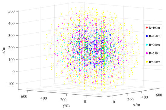 Referring to the existing statistical data of the mine and the analysis of the assumption of the minimum radius and Equation (13), the data of the proposed five levels of the radius (100 m, 150 m, 200 m, 250 m, and 300 m) correspond to the monitoring energy sensitivity, and the sensitivity is assigned. To distinguish the monitoring range of different energy levels of independent sensors and their comprehensive monitoring range after all sensors are superimposed, the distribution of the independent point clouds of each sensor in different monitoring energy levels is shown in Figure 10. Specifically, it is a schematic diagram to distinguish the paving steps of determining the coverage area and the envelope volume for interpolation calculation and, especially, to lay the foundation for the calculation of the envelope volume of the energy-sensing sensitivities corresponding to the different monitoring radii of all sensors.