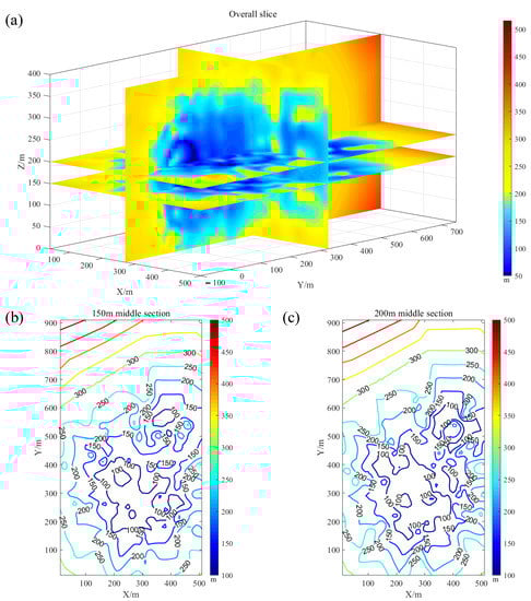 The result of the interpolation calculation of the current deployment’s network efficiency: (a) overall slice; (b) 150 m middle section; (c) 200 m middle section.