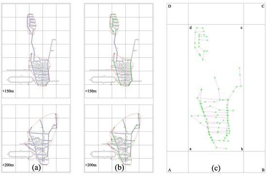 Model construction of the network layout in the target area of the mine: (a) delineation of the monitoring range; (b) proposed sensor points; (c) construction of a simulation model and boundaries: a, b, c, d are the actual boundary limit coordinate point considering the sensor point database; A, B, C, D mean boundary limit coordinate points for numerical simulation considering sensor monitoring efficiency.