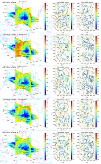 Figure 14 shows the monitoring efficiency results of the five optimal networks, determined using the above optimization method at different radiation radius energy levels of 100 m, 150 m, 200 m, 250 m, and 300 m. The color change from cool to warm indicates that the minimum energy level required to monitor the event is becoming increasingly higher. In other words, if you need to achieve a larger monitoring range performance, you need a certain mesh layout to sense events that are more distant using smaller energy levels. By comparing the envelope ranges of the monitoring energy level sensitivity under different radiation radii, and then performing a weighted comparison, five optimal layout schemes are selected. This is in sharp contrast to the current monitoring network used in mines, which is established via the monitoring range of different energy levels. In addition, the network layout optimized using the new method provides a more obvious data comparison under different radiation radii, indicating that the new method is superior to the traditional method.