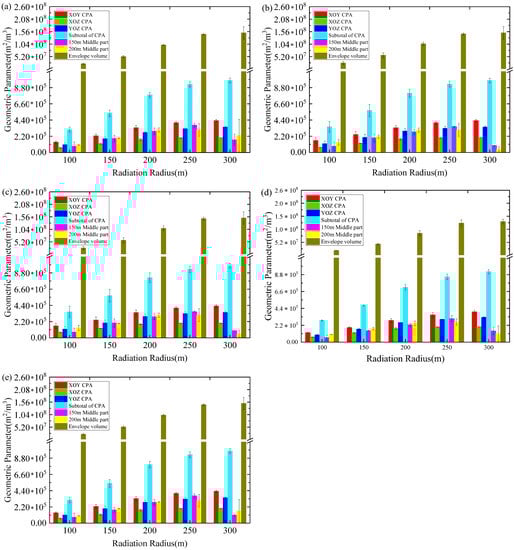 Average absolute distance error and standard deviation of the calculation results of various geometric parameters under multi-level radiation radii: (a) advantage scheme Ⅰ; (b) advantage scheme Ⅱ; (c) advantage scheme Ⅲ; (d) advantage scheme Ⅳ; (e) advantage scheme Ⅴ.