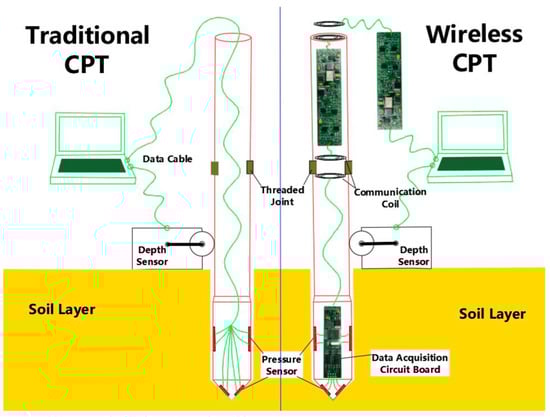 The traditional CPT device is shown in the left part of Figure 1. Steel pipes are connected by threads to form a CPT string. On the end of the CPT string is an electronic probe with a conical tip, and various sensors can be installed inside the probe. The CPT string is usually pushed vertically into the soil at a speed of about 2 cm/s by a hydraulic thrust device [9]. When the CPT string moves into soil, the roller of the depth sensor coupled with the string through friction will rotate. A photoelectric rotating encoder set in the depth sensor will record the depth of the probe under the ground when the probe is moving. The signal collected by the probe is transmitted to the receiving equipment on the ground in real time through a long cable passed through all the probe rods [10]. The receiving equipment will amplify, digitize, analyze and store the signal in turn. The receiving equipment will display the final pressure data on the screen for the ground operator to view. If operators find abnormal data and can judge that the probe hit the hard rock stratum, they need to stop in time to avoid damage to the probe.
