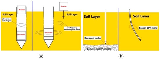 The use of special probe rods with communication function seems to be a feasible method. However, it has not been promoted yet, which possibly because it is extremely difficult to maintain these fine structure steel pipes in harsh exploration environment. Other researchers try to temporarily store the exploration data in the probe underground and take out the data in the probe after the exploration. Although CPT does not require high real-time data, it is unacceptable in most cases if the underground state cannot be known in the whole exploration process. When the probe is pressed onto the hard rock stratum and cannot stop in time, it will probably damage the probe and lose data [21]. When the CPT string is seriously inclined, the pressure data will not match the depth, and even the CPT string will be broken. All these require that the state of the underground probe can be known during the exploration process. Figure 2b shows these situations.