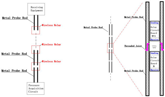 The new CPT system includes a probe, pressure sensor, depth sensor, data acquisition circuit, data relay circuit and control program. The right half of Figure 1 shows the structure of the new system. The pressure sensor is embedded in the probe, and the data acquisition circuit board and battery are installed in the probe lumen. To prevent water ingress when working underground, the magnetic communication coil, data relay circuit board and battery are sealed in a plastic pipe and then plugged into the CPT metal probe rod. Each probe rod is equipped with batteries, receiving and transmitting circuits, which can receive and retransmit data.