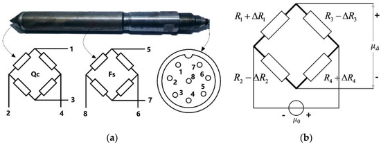 We used a common standard probe whose actuality is shown in Figure 4a. It does not need to be specially made, you can buy it easily. The cylindrical probe has a conical tip of apex angle equal to 60° and a bottom area of 15 cm2, the surface area of side wall friction cylinder is 300 cm2. The probe tip can withstand a maximum force of 6300 N. Two Wheatstone bridge sensors are set inside the probe. The pressure sensor is composed of four metal foil resistance strain gauges. When the strain gauge is bent by external force, the resistance value changes and the bridge loses balance to produce voltage output [22,23].