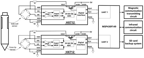 Applying different pressure to the probe, the value of will be different, so different can be obtained. Based on this, we measured a series of values in the laboratory and calibrated the probe. Two HX712 chips are used to process two bridges, respectively. HX712 is a dedicated chip for measuring bridge sensors, it has a low noise amplifier with a gain of 128 times and a 24-bit high precision ADC. When the chip is in standby, the MOS switch in the chip will turn off the power supply of the sensor. According to the data provided by the manufacturer, the standby current of HX712 is less than 1 µA, and the typical operating current is 1 mA [24]. The ultra-low power consumption is beneficial for prolonging the time of using the probe underground. The MCU of the acquisition circuit uses MSP430F149 produced by Texas Instruments (Dallas, TX, USA), which can enter low power mode when it is not working [25,26]. MSP430 Series MCU is famous for its low power consumption. The composition of the acquisition circuit is shown in Figure 5.