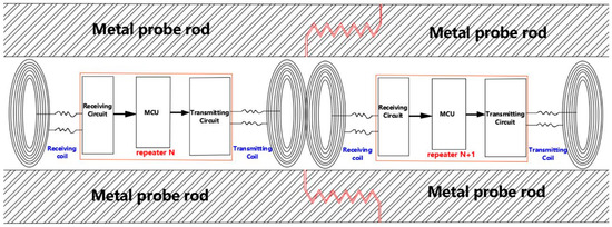 The repeater is composed of signal transmitting circuit, signal receiving circuit, MCU, communication coil, power management circuit and battery. Figure 6 shows the composition of the repeater and the pairing of the coils. During exploration, it is necessary to connect the metal probe through the threaded joint, and the communication coils will be close to each other during the process of tightening the threaded joint. After the threaded joint is connected, the distance between the paired transmitting coil and the receiving coil is usually less than 2 cm. During the test, we set the distance to 6 cm and could still communicate normally. Obviously, a smaller distance under actual working conditions is better to ensure the quality and stability of communication.