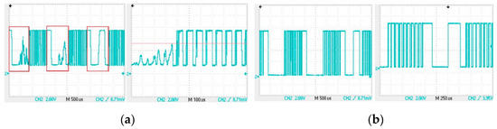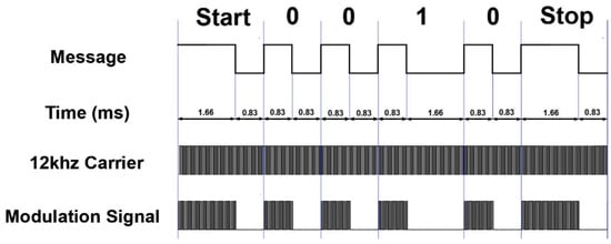 In order to reduce the system cost, STC15F104 is selected as the MCU of the relay circuit, which has limited performance and cannot handle signals with high frequency. At the same time, the high frequency signal attenuates quickly in the metal pipe [28,29], which also requires the use of a lower carrier frequency. So, we set the carrier frequency to 12 kHz, which is a very low frequency. The information is loaded onto a square carrier with a frequency of 12 kHz and a duty cycle of 33% to form a modulated signal.